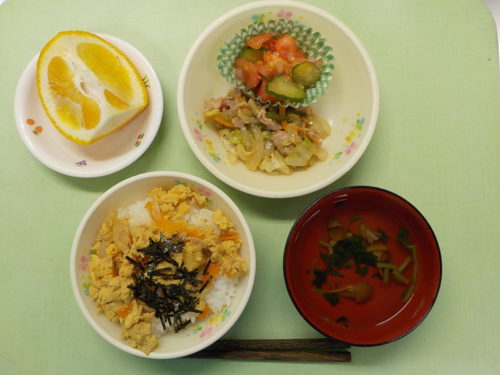 ホームきょうの給食 6/7今日の給食 2021年6月7日2021年7月31日 【幼児食・乳児食】 子どもたちが大好きな給食やおやつを毎日紹介しています! 昼食 ツナ玉丼 すまし汁 豚肉と野菜の炒め物 トマトサラダ 甘夏 3時のおやつ 牛乳 そぼろごはん 食べる小魚 10時のおやつ(乳児のみ) 牛乳