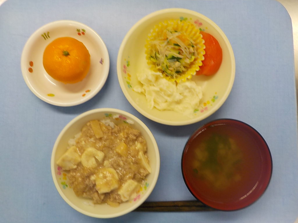 ホームきょうの給食 11/24 今日の給食 2021年11月24日 子どもたちが大好きな給食やおやつを毎日紹介しています! 【幼児食・乳児食】 昼食 麻婆ごはん えのきの中華風すーぷ リヨネーズポテト バンサンスー トマト みかん 3時のおやつ 牛乳 わかめうどん 10時のおやつ(乳児のみ) 飲むヨーグルト