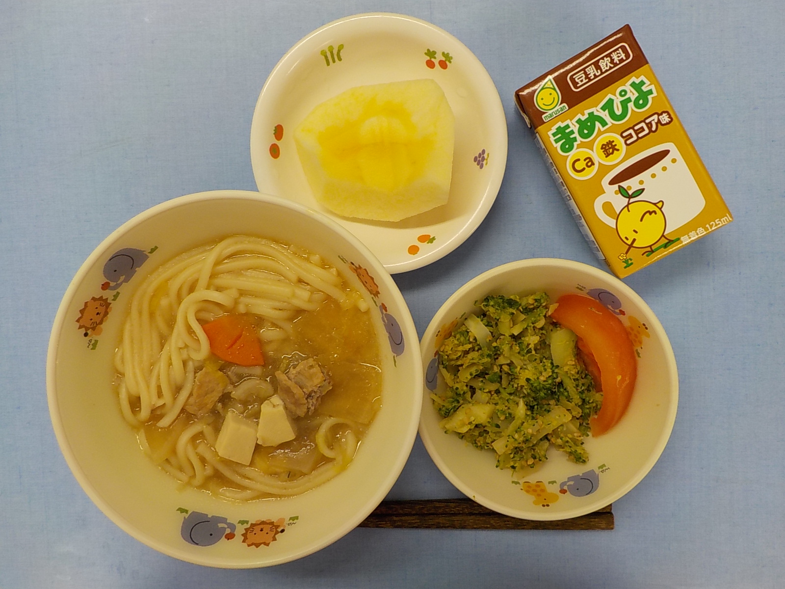 ホームきょうの給食 12/18 今日の給食 2021年12月18日 子どもたちが大好きな給食やおやつを毎日紹介しています! 【幼児食・乳児食】 昼食 みそけんちんうどん ブロッコリーのごま和え トマト りんご まめぴよ(豆乳飲料) 3時のおやつ 麦茶 鮭おにぎり ぬか漬け 10時のおやつ(乳児のみ) キャロットさんミニ