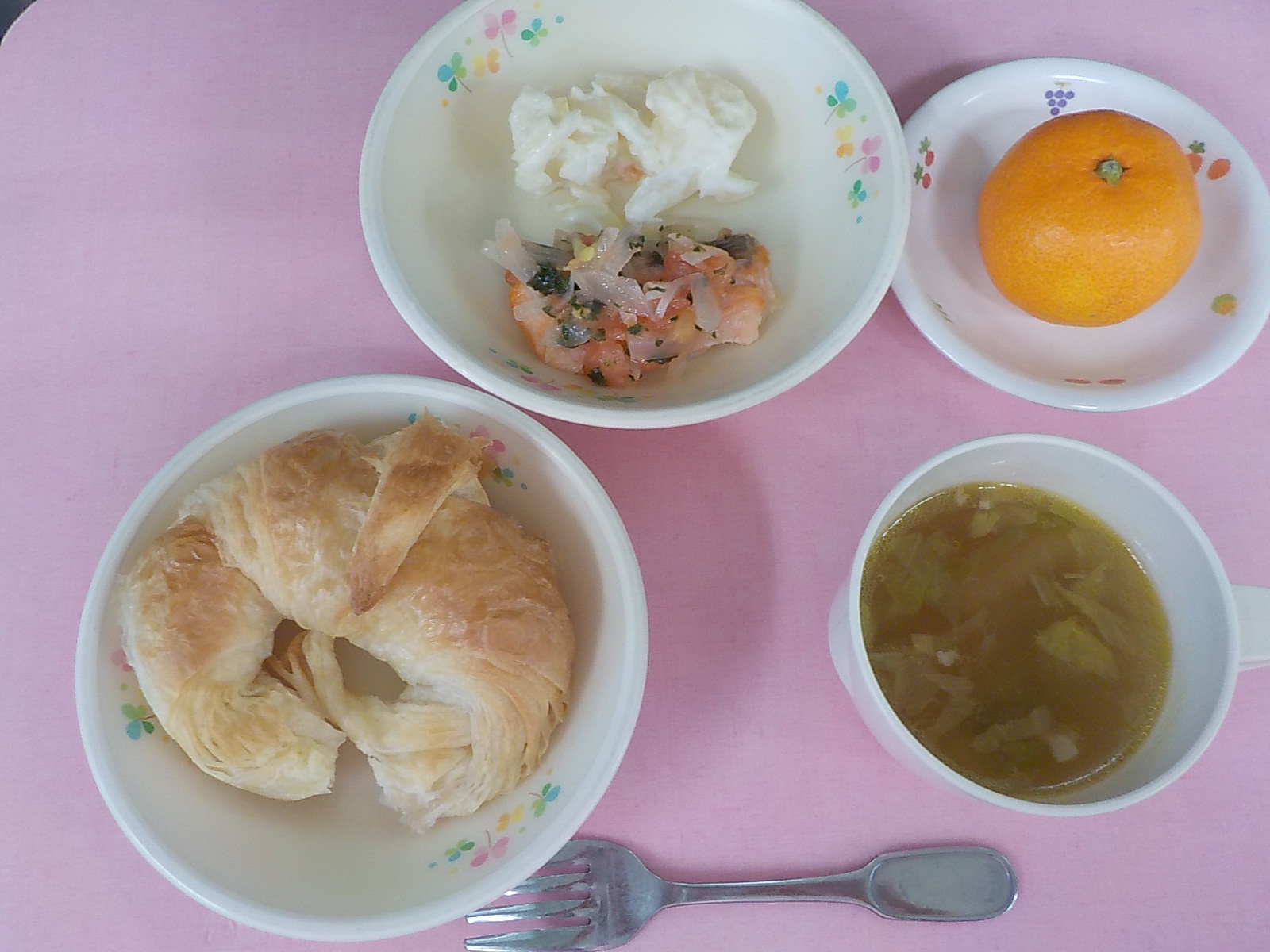 ホームきょうの給食 12/23 今日の給食 2021年12月23日 子どもたちが大好きな給食やおやつを毎日紹介しています! 【幼児食・乳児食】 昼食 クロワッサン ベーコンスープ 鮭のマリネ リヨネーズポテト みかん 3時のおやつ 牛乳 チキンライス スティック人参 10時のおやつ(乳児のみ) ジョア