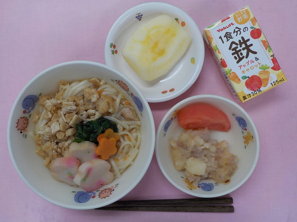 ホームきょうの給食 12/25 今日の給食 2021年12月25日 子どもたちが大好きな給食やおやつを毎日紹介しています! 【幼児食・乳児食】 昼食 年越しうどん 根菜ソテー トマト 野菜ジュース りんご 3時のおやつ 麦茶 そぼろおにぎり 食べる小魚 10時のおやつ(乳児のみ) まめぴよ