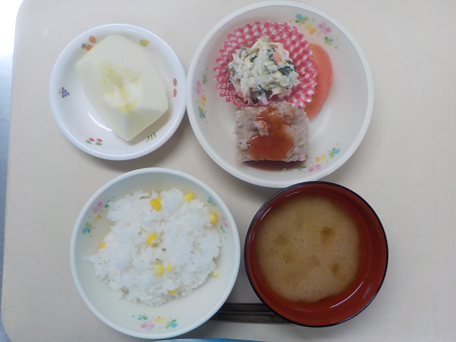 ホームきょうの給食 9/3 今日の給食 2021年9月3日 子どもたちが大好きな給食やおやつを毎日紹介しています! 【幼児食・乳児食】 昼食 とうもろこしごはん みそ汁 みんなのミートローフ 小松菜サラダ トマト りんご 3時のおやつ 牛乳 南瓜の水ようかん 10時のおやつ(乳児のみ) 野菜ジュース