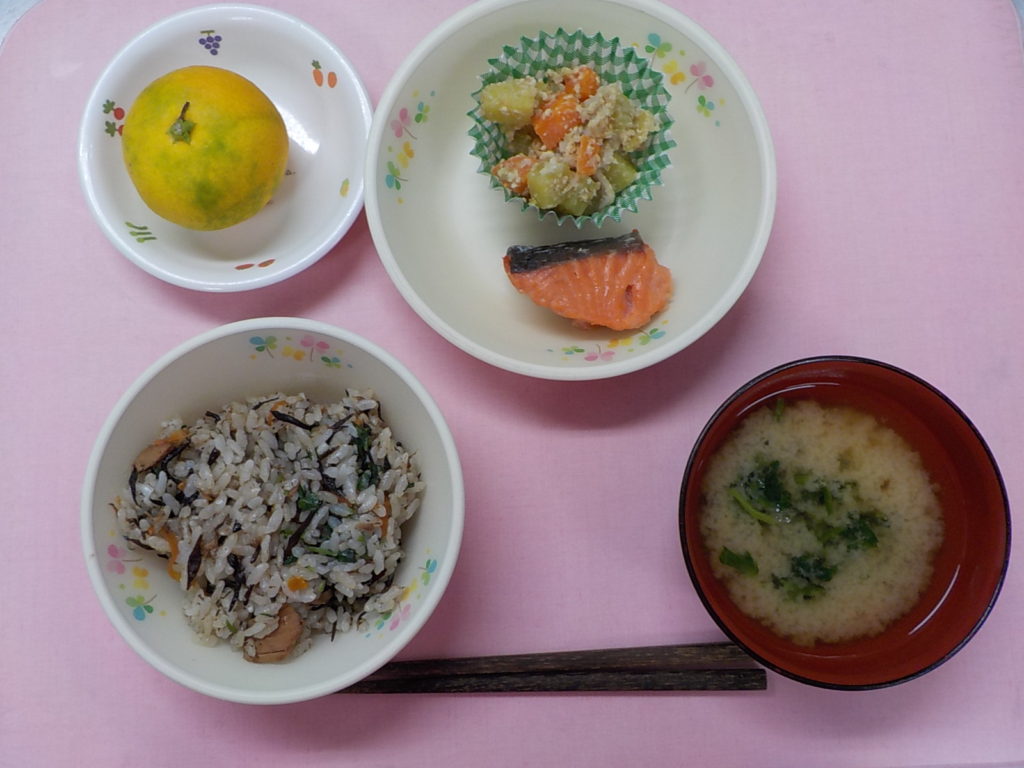 ホームきょうの給食 9/21 今日の給食 2021年9月21日 子どもたちが大好きな給食やおやつを毎日紹介しています! 【幼児食・乳児食】 昼食 ひじきとツナの混ぜごはん みそ汁 焼き魚 ほっこり白和え みかん 3時のおやつ 牛乳 フルーツポンチ おせんべい 10時のおやつ(乳児のみ) ジョア