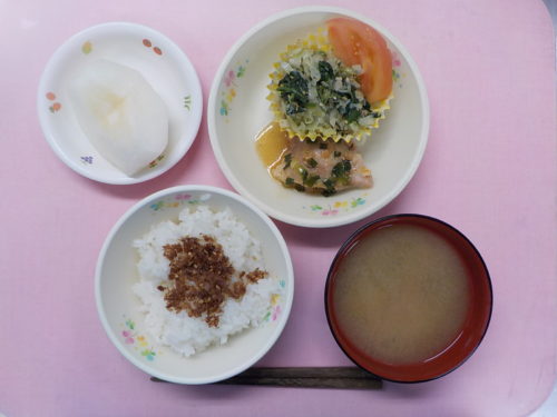 ホームきょうの給食 9/22 今日の給食 2021年9月22日 子どもたちが大好きな給食やおやつを毎日紹介しています! 【幼児食・乳児食】 昼食 おかかごはん みそ汁 油淋鶏 切り干し大根サラダ トマト 梨 3時のおやつ 麦茶 おはぎ 食べる小魚 10時のおやつ(乳児のみ) 牛乳