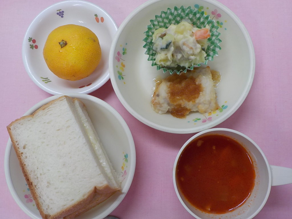 ホームきょうの給食 10/7 今日の給食 2021年10月7日 子どもたちが大好きな給食やおやつを毎日紹介しています! 【幼児食・乳児食】 昼食 バターサンド ミネストローネ 魚のステーキソース さつま芋のマセドアンサラダ みかん 3時のおやつ ジョア 鶏ぞうすい 10時のおやつ(乳児のみ) 牛乳