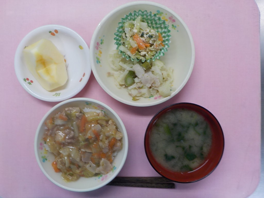 ホームきょうの給食 10/19 今日の給食 2021年10月19日 子どもたちが大好きな給食やおやつを毎日紹介しています! 【幼児食・乳児食】 昼食 ぶた中華麦丼 みそ汁 アスパラベーコンソテー 豆腐サラダ りんご 3時のおやつ 牛乳 ホットケーキ 10時のおやつ(乳児のみ) 野菜ジュース