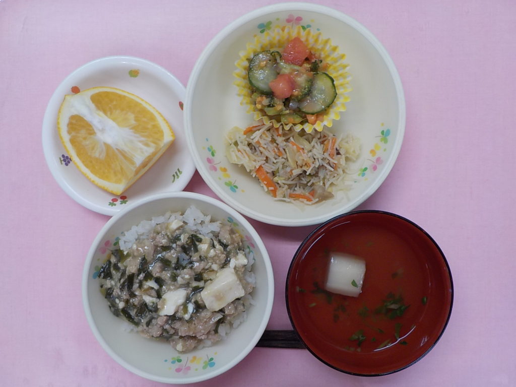 ホームきょうの給食 1/5 今日の給食 2022年1月5日 子どもたちが大好きな給食やおやつを毎日紹介しています! 【幼児食・乳児食】 昼食 マーボー麦丼 すまし汁 ビーフンの炒め物 トマトサラダ はっさく 3時のおやつ 牛乳 干し芋 食べる小魚 10時のおやつ(乳児のみ) 牛乳