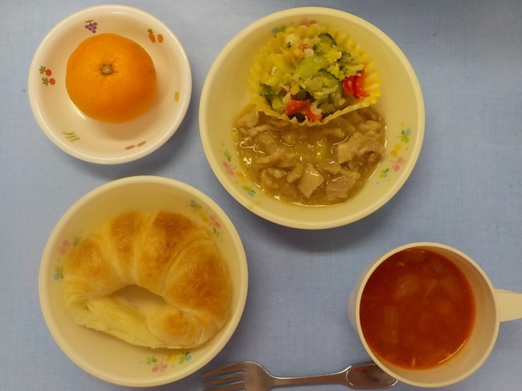 ホームきょうの給食 1/20 今日の給食 2022年1月20日 子どもたちが大好きな給食やおやつを毎日紹介しています! 【幼児食・乳児食】 昼食 クロワッサン ミネストローネ 豚肉とりんごのカレー煮 ブロッコリーサラダ みかん 3時のおやつ ジョア みそ雑炊 10時のおやつ(乳児のみ) 牛乳