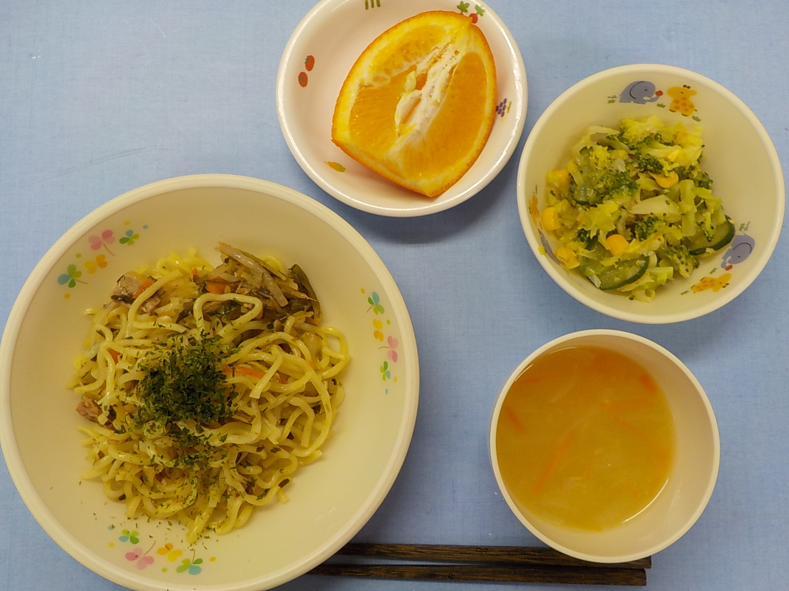 ホームきょうの給食 2/5 今日の給食 2022年2月5日2022年2月7日 子どもたちが大好きな給食やおやつを毎日紹介しています! 【幼児食・乳児食】 昼食 焼きそば 中華風コーンスープ ミックスサラダ いよかん 3時のおやつ 麦茶 ツナピラフ 食べる小魚 10時のおやつ(乳児のみ) まめぴよ