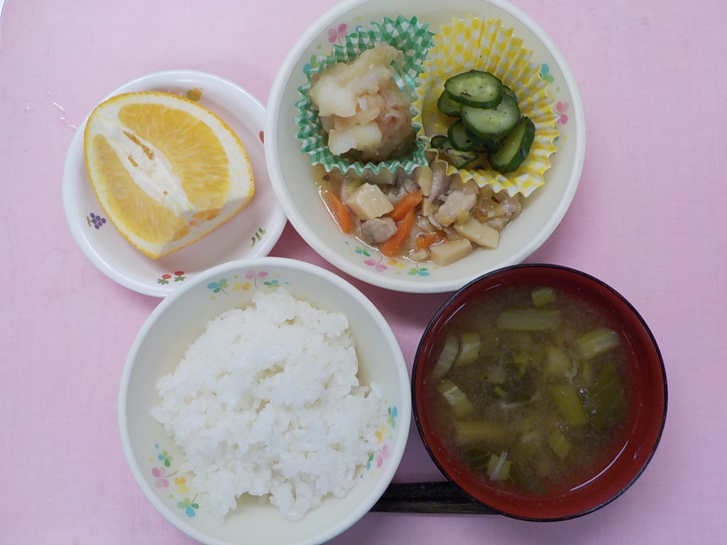 ホームきょうの給食 2/8 今日の給食 2022年2月8日 子どもたちが大好きな給食やおやつを毎日紹介しています! 【幼児食・乳児食】 昼食 ごはん みそ汁 鶏肉のハオユウ炒め 胡瓜のゆかり和え ポテトの土佐煮 はっさく 3時のおやつ ジョア 肉わかめうどん 10時のおやつ(乳児のみ) 牛乳