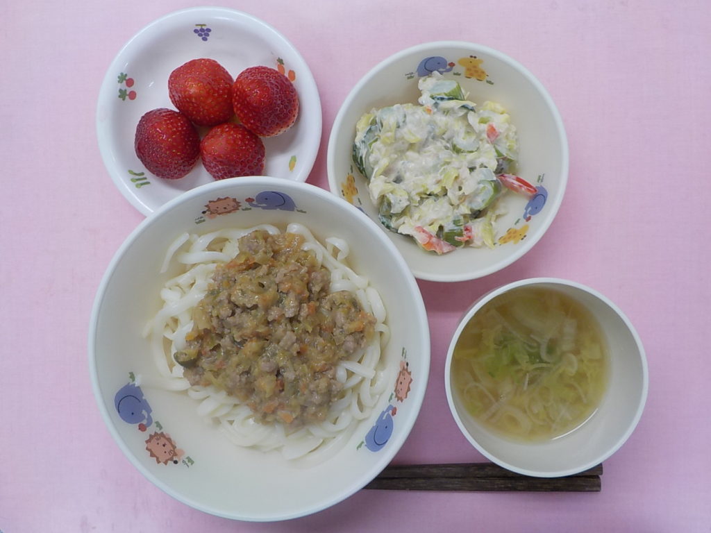 ホームきょうの給食 2/19 今日の給食 2022年2月19日 子どもたちが大好きな給食やおやつを毎日紹介しています! 【幼児食・乳児食】 昼食 肉みそうどん 白菜のとろみスープ ツナサラダ いちご 3時のおやつ 野菜ジュース トマトスープライス 10時のおやつ(乳児のみ) まめぴよ