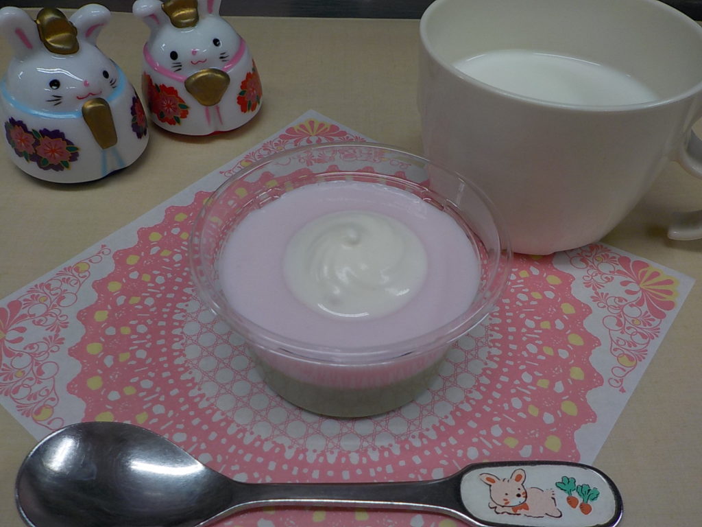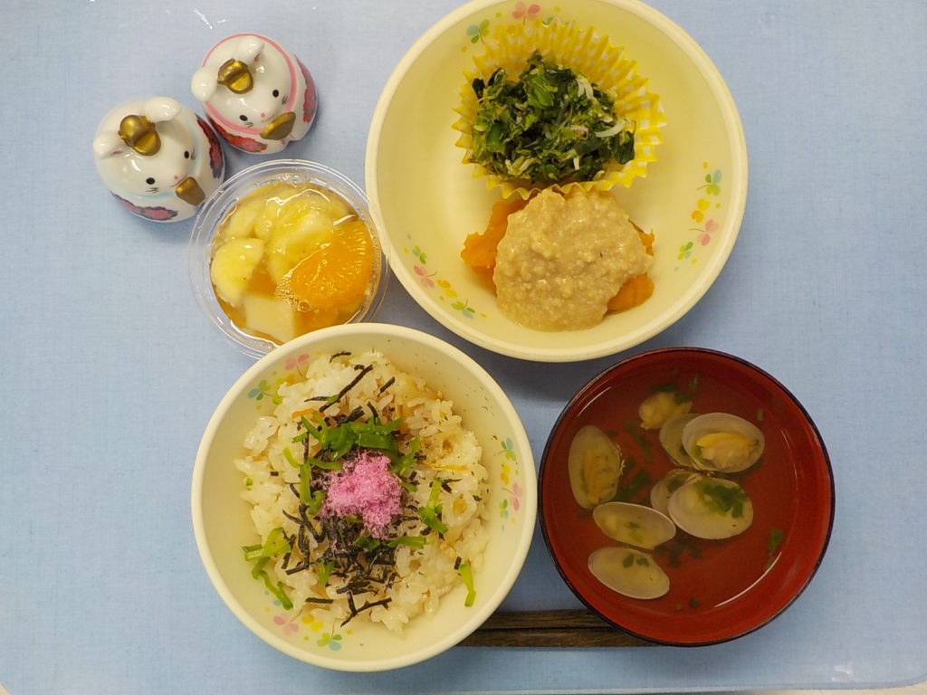 ホームきょうの給食 3/3 今日の給食 2022年3月3日 子どもたちが大好きな給食やおやつを毎日紹介しています! 【幼児食・乳児食】 昼食 五目ちらし寿司 潮汁 南瓜のそぼろあん 菜花のおかか和え フルーツポンチ 3時のおやつ 牛乳 三色ババロア 10時のおやつ(乳児のみ) 野菜ジュース