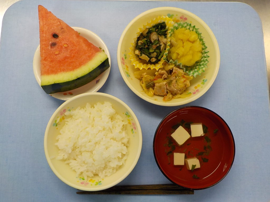 ホームきょうの給食 6/8 今日の給食 2022年6月8日 子どもたちが大好きな給食やおやつを毎日紹介しています! 【幼児食・乳児食】 昼食 ごはん すまし汁 ホイコーロー おひたし さつま芋の甘煮 すいか 3時のおやつ 牛乳 ウィンナーカップケーキ 10時のおやつ(乳児のみ) 野菜ジュース