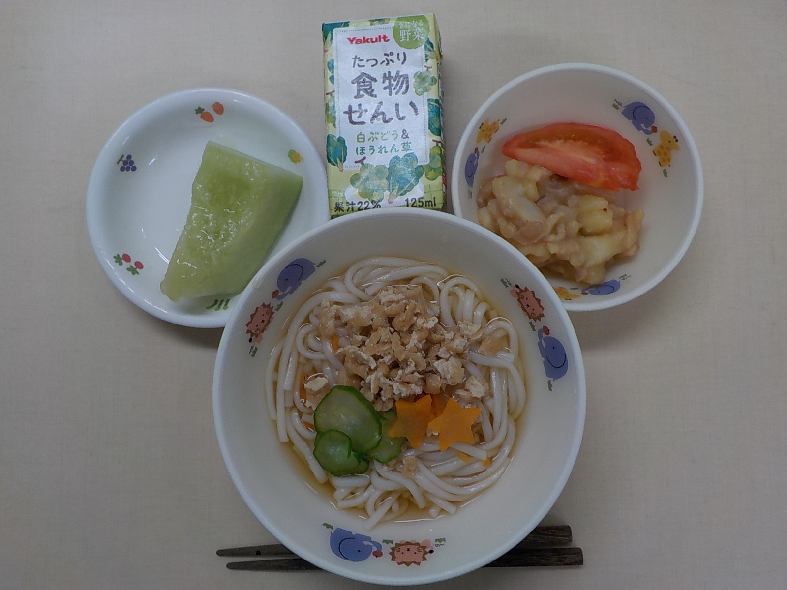 ホームきょうの給食 6/11 今日の給食 2022年6月11日 子どもたちが大好きな給食やおやつを毎日紹介しています! 【幼児食・乳児食】 昼食 冷やしきつねうどん 根菜ソテー トマト メロン 3時のおやつ 麦茶 ゆかりおにぎり 食べる小魚 10時のおやつ(乳児のみ) まめぴよ
