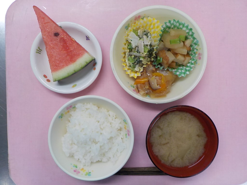 ホームきょうの給食 6/24 今日の給食 2022年6月24日2022年6月25日 子どもたちが大好きな給食やおやつを毎日紹介しています! 【幼児食・乳児食】 昼食 ごはん みそ汁 鶏肉の甘酢あんかけ 小松菜サラダ 大根とさつま揚げの煮物 すいか 3時のおやつ 牛乳 あじさいゼリー おせんべい 10時のおやつ(乳児のみ) キャロットジュース