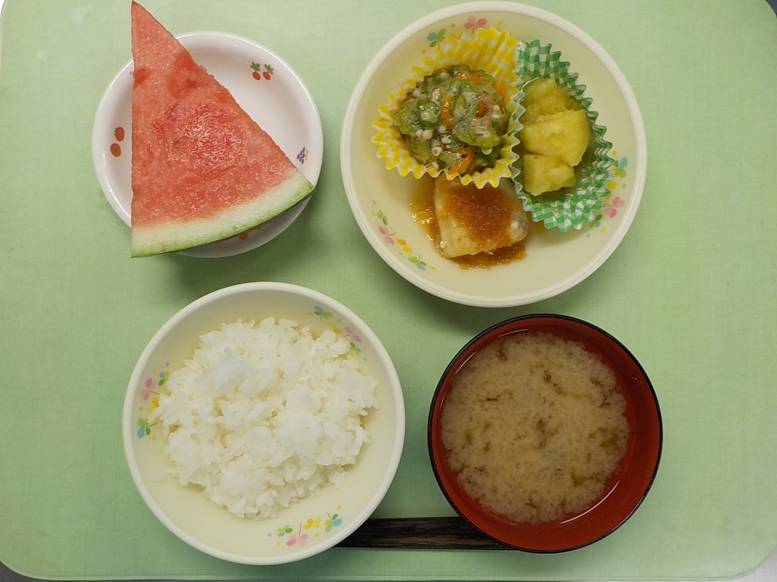 ホームきょうの給食 7/4今日の給食 2022年7月4日 子どもたちが大好きな給食やおやつを毎日紹介しています! 【幼児食・乳児食】 昼食 ごはん みそ汁 かじきのステーキソース さつま芋の甘煮 オクラのおひたし すいか 3時のおやつ 牛乳 グレープゼリー おせんべい 10時のおやつ(乳児のみ) ジョア