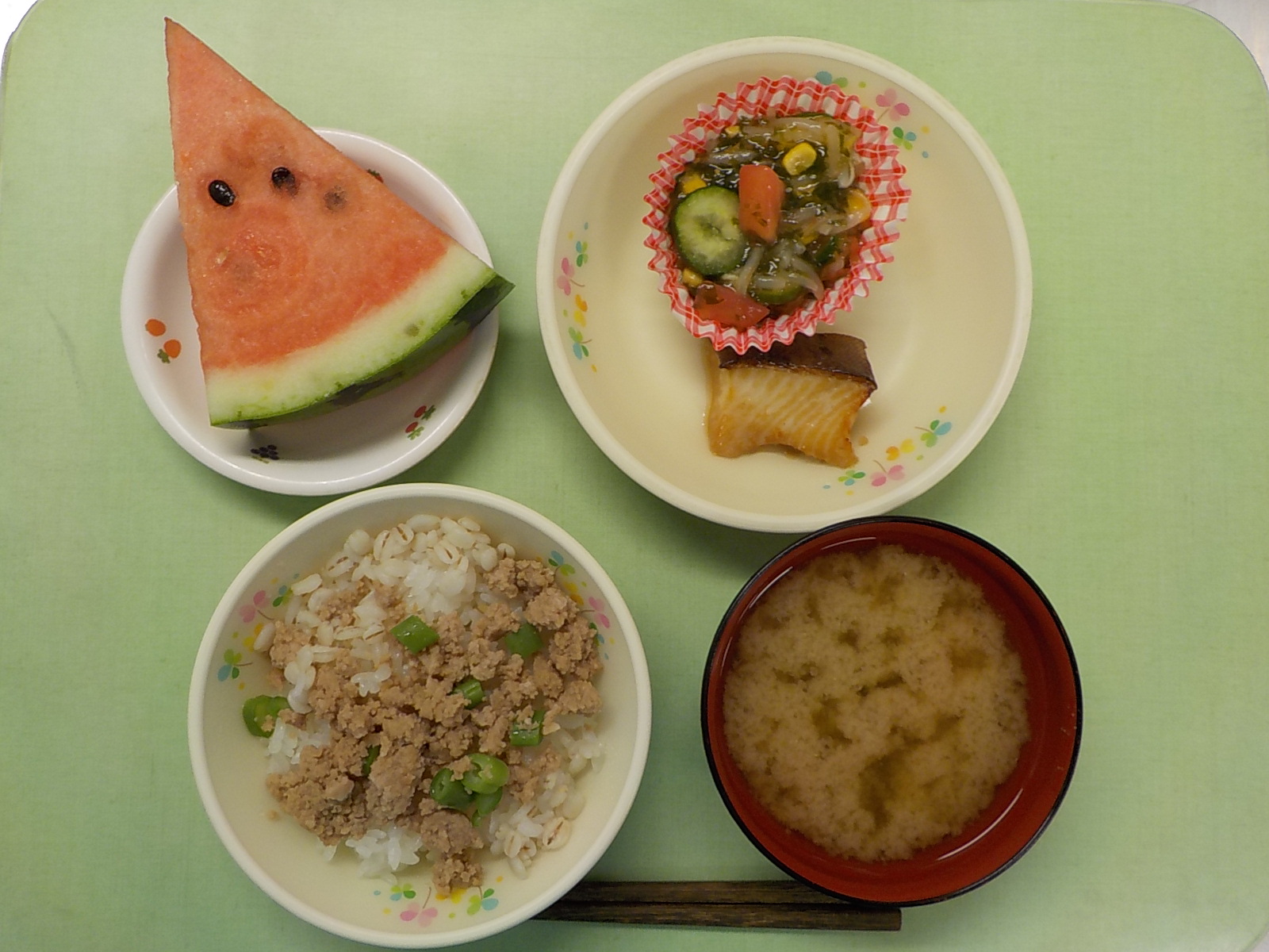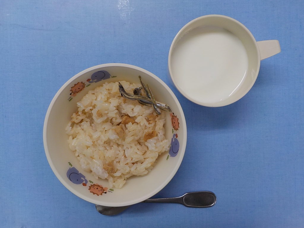 ホームきょうの給食 7/25 今日の給食 2022年7月25日 子どもたちが大好きな給食やおやつを毎日紹介しています! 【幼児食・乳児食】 昼食 しぐれ麦丼 みそ汁 銀だらの照り焼き 和風サラダ すいか 3時のおやつ 牛乳 こぎつねごはん 食べる小魚 10時のおやつ(乳児のみ) ジョア