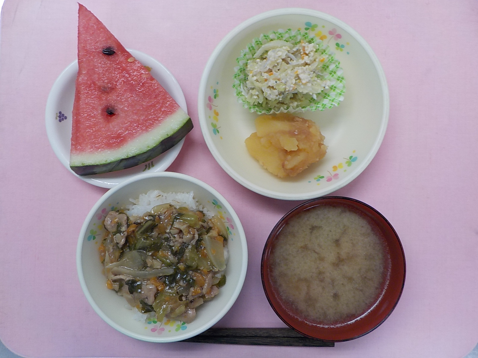 ホームきょうの給食 8/2 今日の給食 2022年8月2日 子どもたちが大好きな給食やおやつを毎日紹介しています! 【幼児食・乳児食】 昼食 あんかけ麦丼 みそ汁 豆腐としらすのサラダ ポテトの土佐煮 すいか 3時のおやつ 牛乳 信玄マカロニ 10時のおやつ(乳児のみ) 野菜ジュース