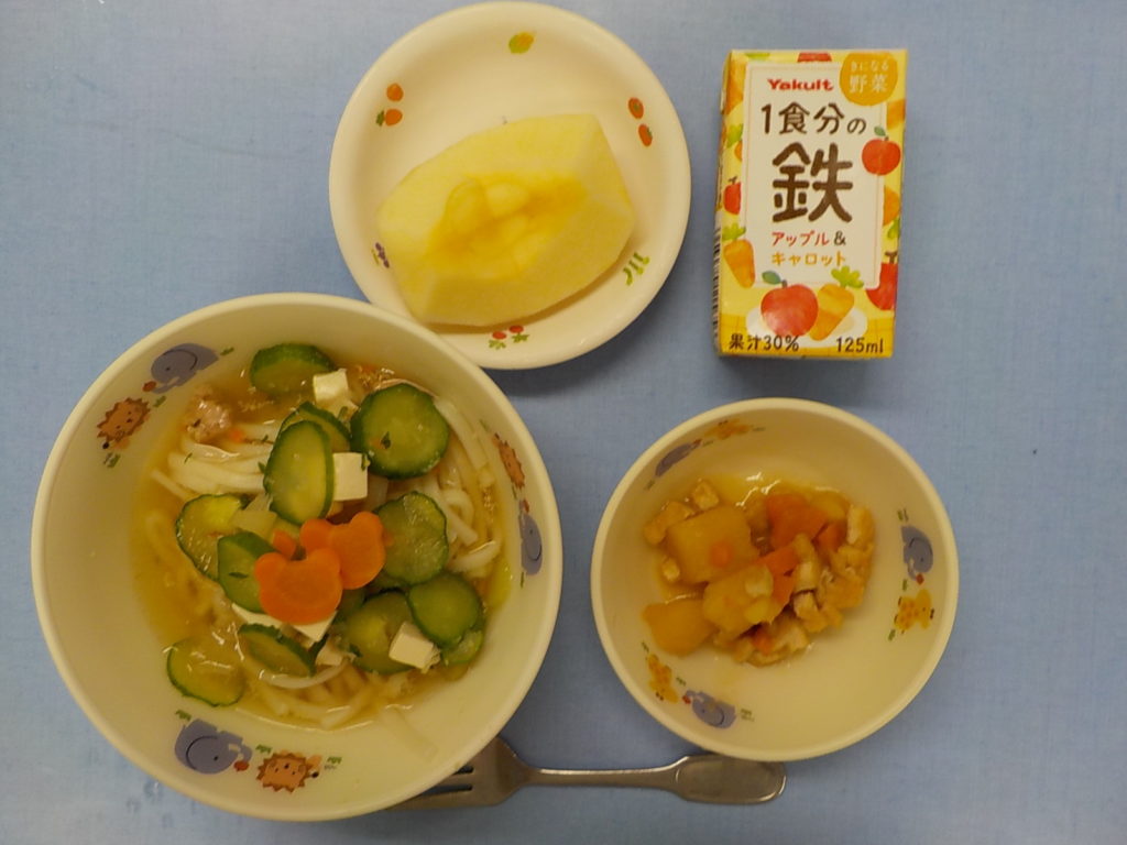 ホームきょうの給食 8/6 今日の給食 2022年8月6日 子どもたちが大好きな給食やおやつを毎日紹介しています! 【幼児食・乳児食】 昼食 冷や汁うどん ポテトの煮物 野菜ジュース りんご 3時のおやつ 麦茶 そぼろごはん ぬか漬け 10時のおやつ(乳児のみ) まめぴよ