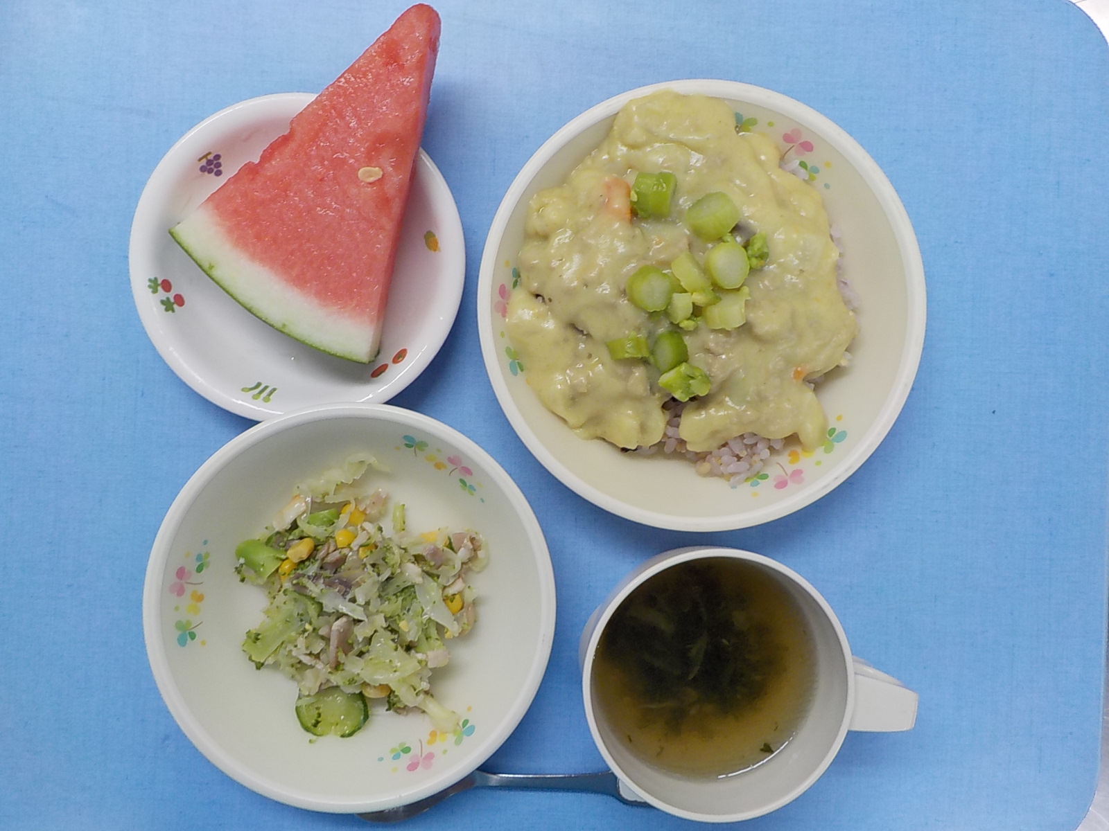 ホームきょうの給食 8/10 今日の給食 2022年8月10日 子どもたちが大好きな給食やおやつを毎日紹介しています! 【幼児食・乳児食】 昼食 夏野菜カレー雑穀ライス わかめスープ 森のサラダ すいか 3時のおやつ 牛乳 小町麩スナック 10時のおやつ(乳児のみ) 野菜ジュース