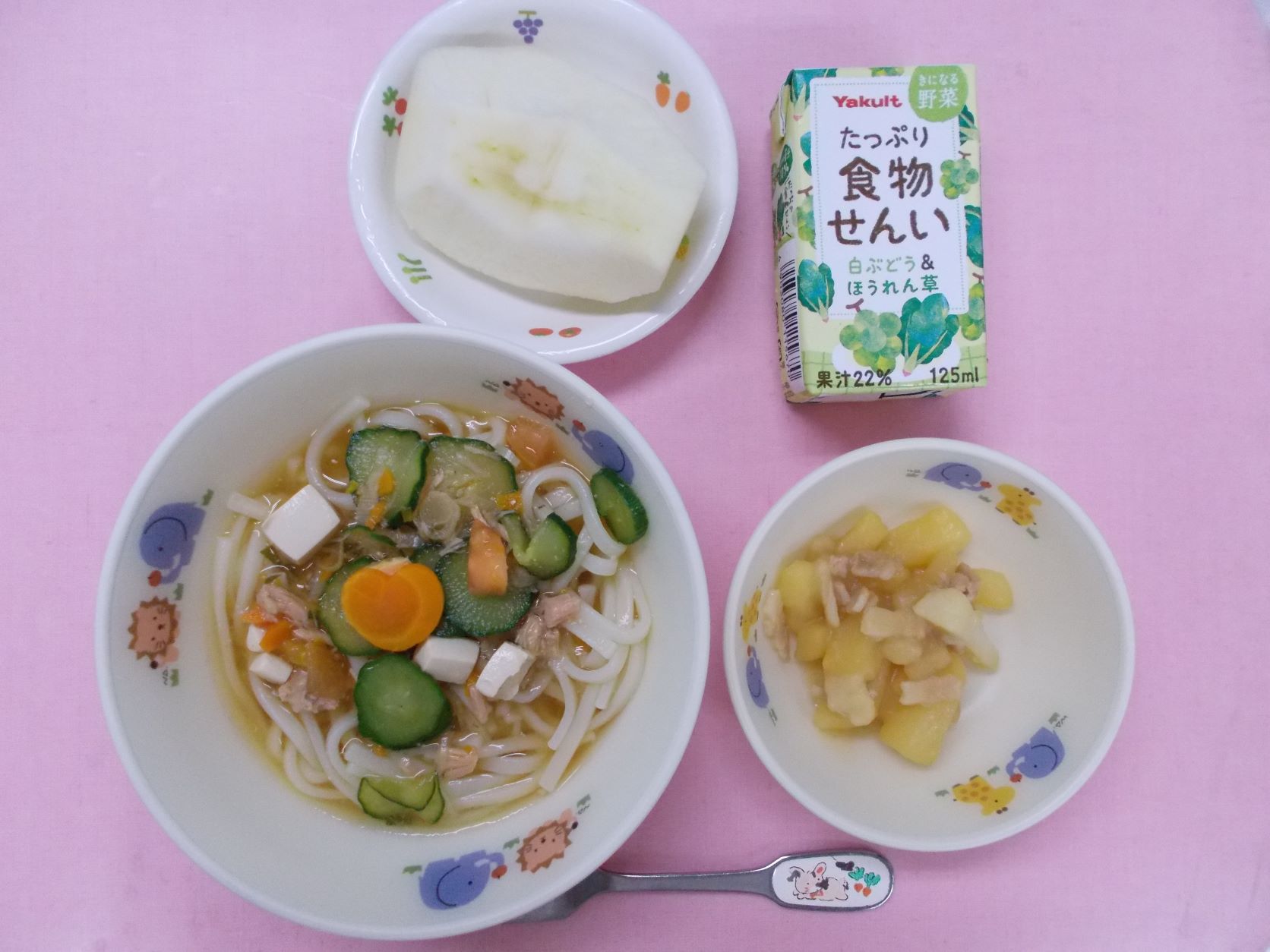 ホームきょうの給食 9/3 今日の給食 2022年9月5日 子どもたちが大好きな給食やおやつを毎日紹介しています! 【幼児食・乳児食】 昼食 冷や汁うどん 根菜ソテー 野菜ジュース りんご 3時のおやつ 麦茶 こんぶおにぎり 食べる小魚 10時のおやつ(乳児のみ) まめぴよ