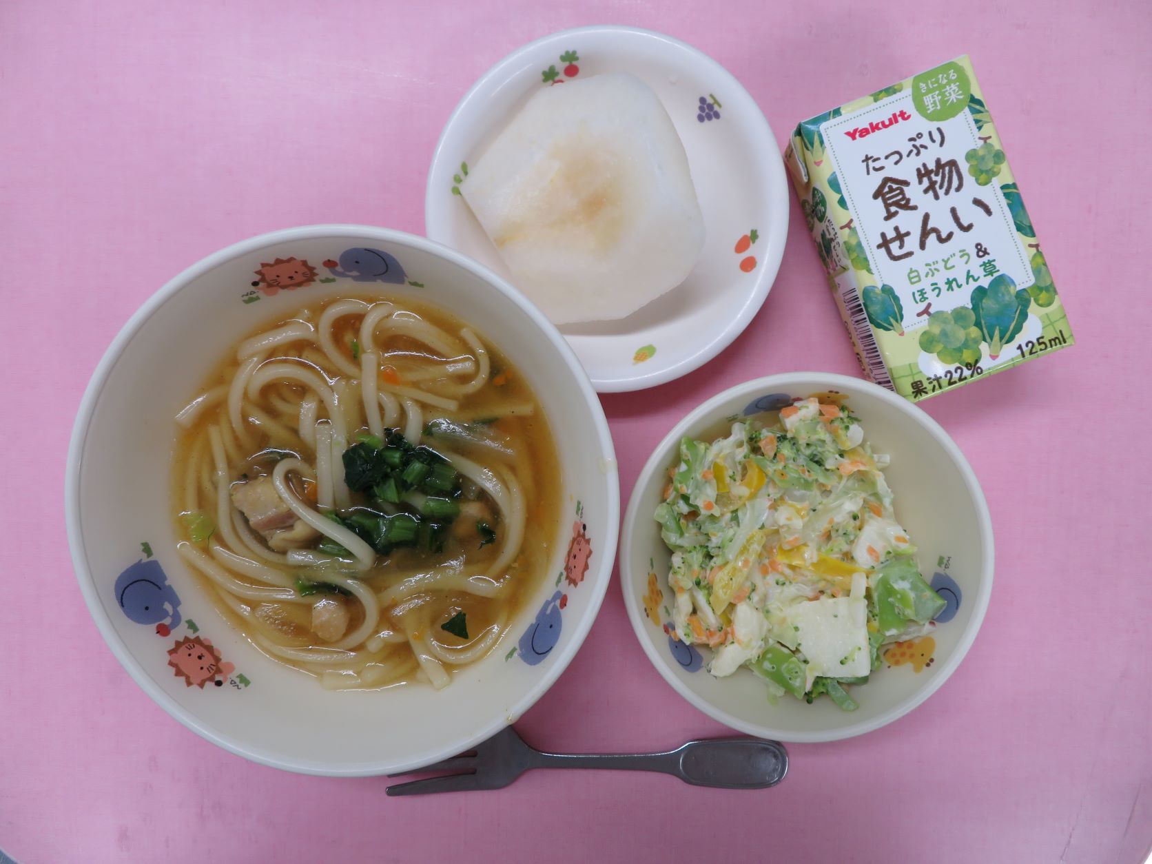 ホームきょうの給食 9/10 今日の給食 2022年9月10日 子どもたちが大好きな給食やおやつを毎日紹介しています! 【幼児食・乳児食】 昼食 鶏カレー南蛮(乳:かしわうどん) キャベツとりんごのサラダ 野菜ジュース(乳:まめぴよ) 梨 3時のおやつ 麦茶 ふりかけおにぎり ぬか漬け 10時のおやつ(乳児のみ) キャロットジュース