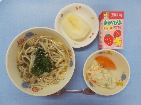 ホームきょうの給食 9/24 今日の給食 2022年9月24日 子どもたちが大好きな給食やおやつを毎日紹介しています! 【幼児食・乳児食】 昼食 五目うどん ポテトサラダ トマト りんご まめぴよ 3時のおやつ 麦茶 そぼろおにぎり 食べる小魚 10時のおやつ(乳児のみ) 野菜ジュース