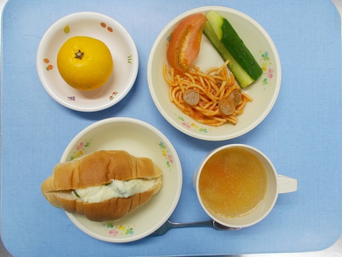 ホームきょうの給食 10/6 今日の給食 2022年10月6日 子どもたちが大好きな給食やおやつを毎日紹介しています! 【幼児食・乳児食】 昼食 ポテトロールサンド かぶのスープ ナポリタン スティック胡瓜 トマト みかん 3時のおやつ 牛乳 切り干し大根おにぎり ぬか漬け 10時のおやつ(乳児のみ) 牛乳