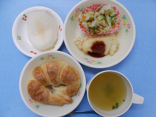 ホームきょうの給食 10/20 今日の給食 2022年10月20日 子どもたちが大好きな給食やおやつを毎日紹介しています! 【幼児食・乳児食】 昼食 クロワッサン オニオンスープ 魚のフライ ブロッコリーサラダ 梨 3時のおやつ ジョア 鮭茶漬け 10時のおやつ(乳児のみ) 牛乳