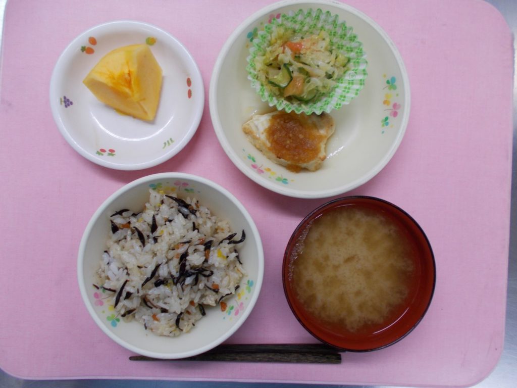 ホームきょうの給食 11/8今日の給食 2022年11月8日 子どもたちが大好きな給食やおやつを毎日紹介しています! 【幼児食・乳児食】 昼食 ひじきご飯 みそ汁 魚のバーベキューソースかけ コンビネーションサラダ 柿 3時のおやつ 牛乳 チャンポン麺 10時のおやつ(乳児のみ) ジョア