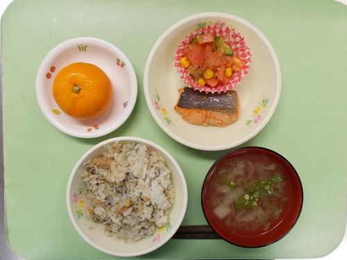 ホームきょうの給食 11/28 今日の給食 2022年11月28日 子どもたちが大好きな給食やおやつを毎日紹介しています! 【幼児食・乳児食】 昼食 豚肉とえのきのごはん 白菜のとろみスープ 鮭の西京焼き トマトサラダ みかん 3時のおやつ ジョア チキンフォー 10時のおやつ(乳児のみ) 牛乳