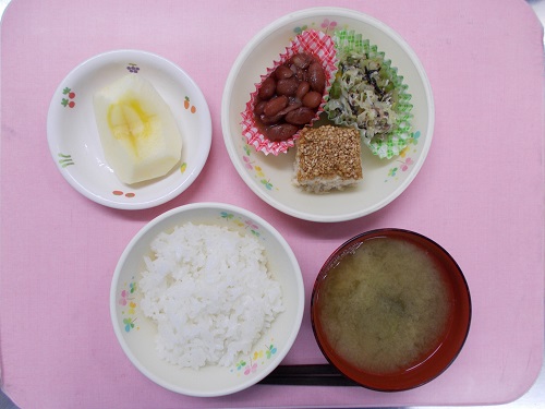 ホームきょうの給食 11/29 今日の給食 2022年11月29日 子どもたちが大好きな給食やおやつを毎日紹介しています! 【幼児食・乳児食】 昼食 ごはん みそ汁 松風焼き カルカルサラダ 金時煮豆 りんご 3時のおやつ 牛乳 和風ツナおにぎり ぬか漬け 10時のおやつ(乳児のみ) 牛乳