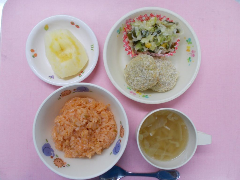 ホームきょうの給食 12/6 今日の給食 2022年12月6日 子どもたちが大好きな給食やおやつを毎日紹介しています! 【幼児食・乳児食】 昼食 チキンライス ベーコンスープ さつまいもコロッケ ホタテサラダ りんご 3時のおやつ 牛乳 ベイクドパン 10時のおやつ(乳児のみ) 野菜ジュース