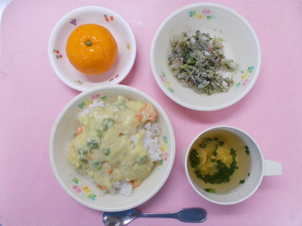 ホームきょうの給食 12/27 今日の給食 2022年12月27日 子どもたちが大好きな給食やおやつを毎日紹介しています! 【幼児食・乳児食】 昼食 カレー麦ライス (め・き:ポークピラフ&ウインナー) すまし汁 シーフードサラダ みかん ※今日のごはんは防災用のごはんです。 3時のおやつ 牛乳 あんぱん 10時のおやつ(乳児のみ) 野菜ジュース