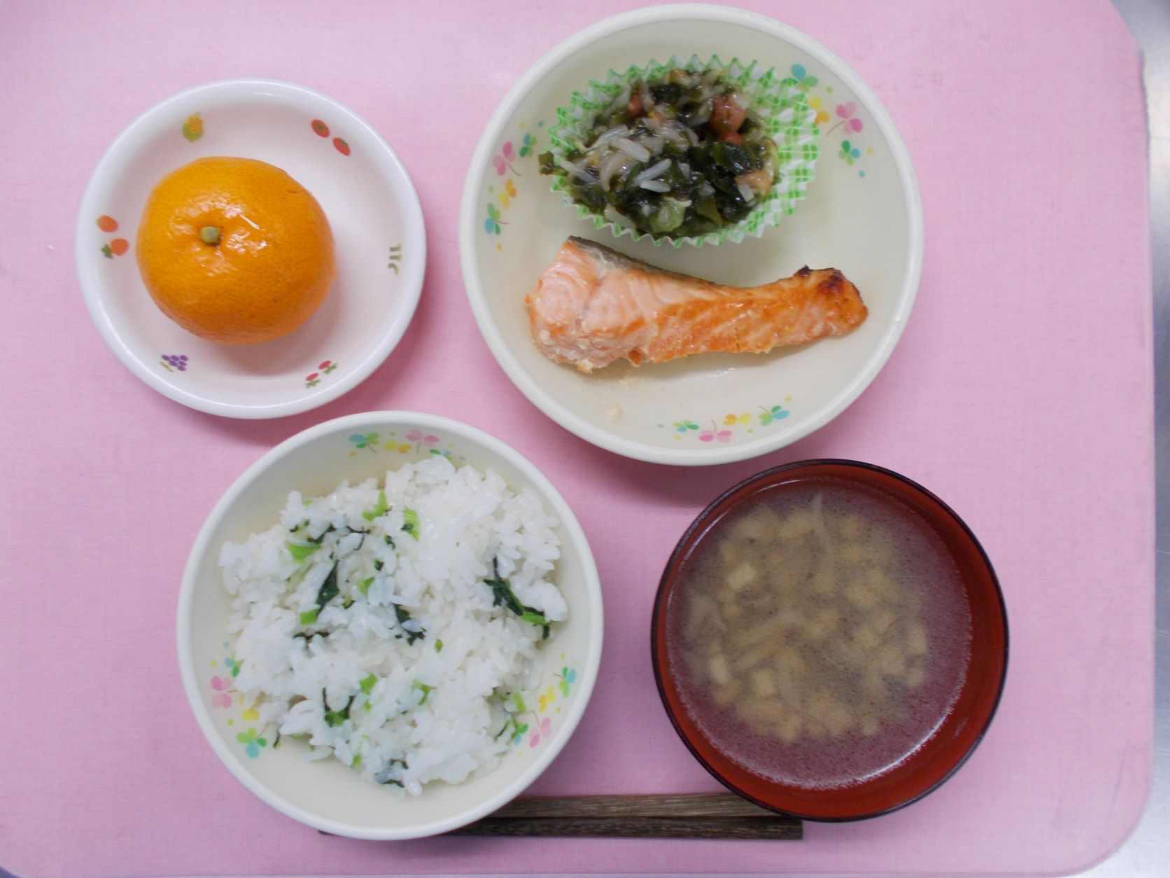 ホームきょうの給食 1/6 今日の給食 2023年1月6日 子どもたちが大好きな給食やおやつを毎日紹介しています! 【幼児食・乳児食】 昼食 七草ごはん すまし汁 鮭のみそマヨドレ焼き 和風サラダ みかん 3時のおやつ 牛乳 きな粉蒸しパン 10時のおやつ(乳児のみ) 野菜ジュース