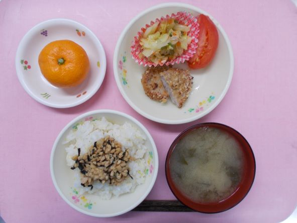 ホームきょうの給食 1/17 今日の給食 2023年1月17日 子どもたちが大好きな給食やおやつを毎日紹介しています! 【幼児食・乳児食】 昼食 納豆きびごはん みそ汁 みそヒレカツ キャベツサラダ トマト みかん 3時のおやつ 牛乳 信玄マカロニ 10時のおやつ(乳児のみ) 牛乳