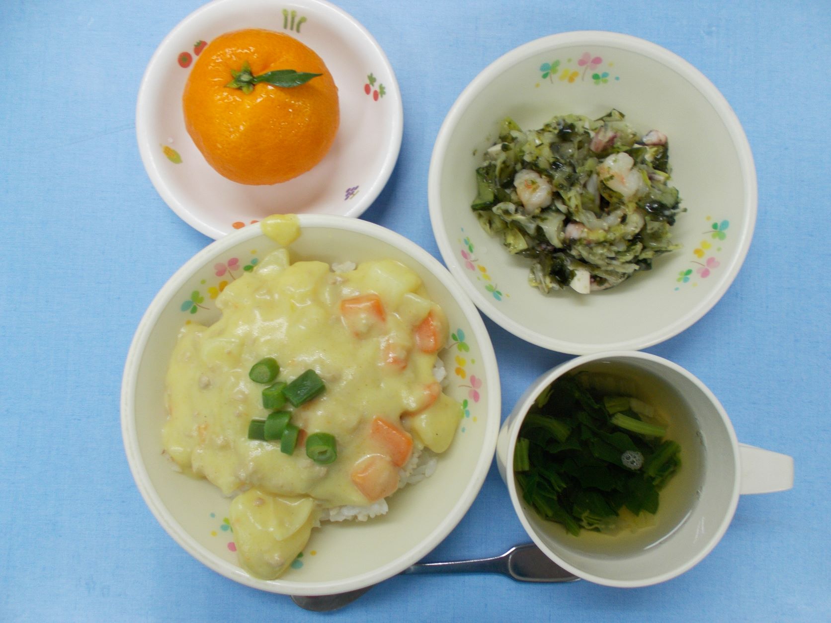 ホームきょうの給食 1/20 今日の給食 2023年1月20日 子どもたちが大好きな給食やおやつを毎日紹介しています! 【幼児食・乳児食】 昼食 カレー麦ライス すまし汁 シーフードサラダ みかん 3時のおやつ 牛乳 ナポリタン 10時のおやつ(乳児のみ) 牛乳