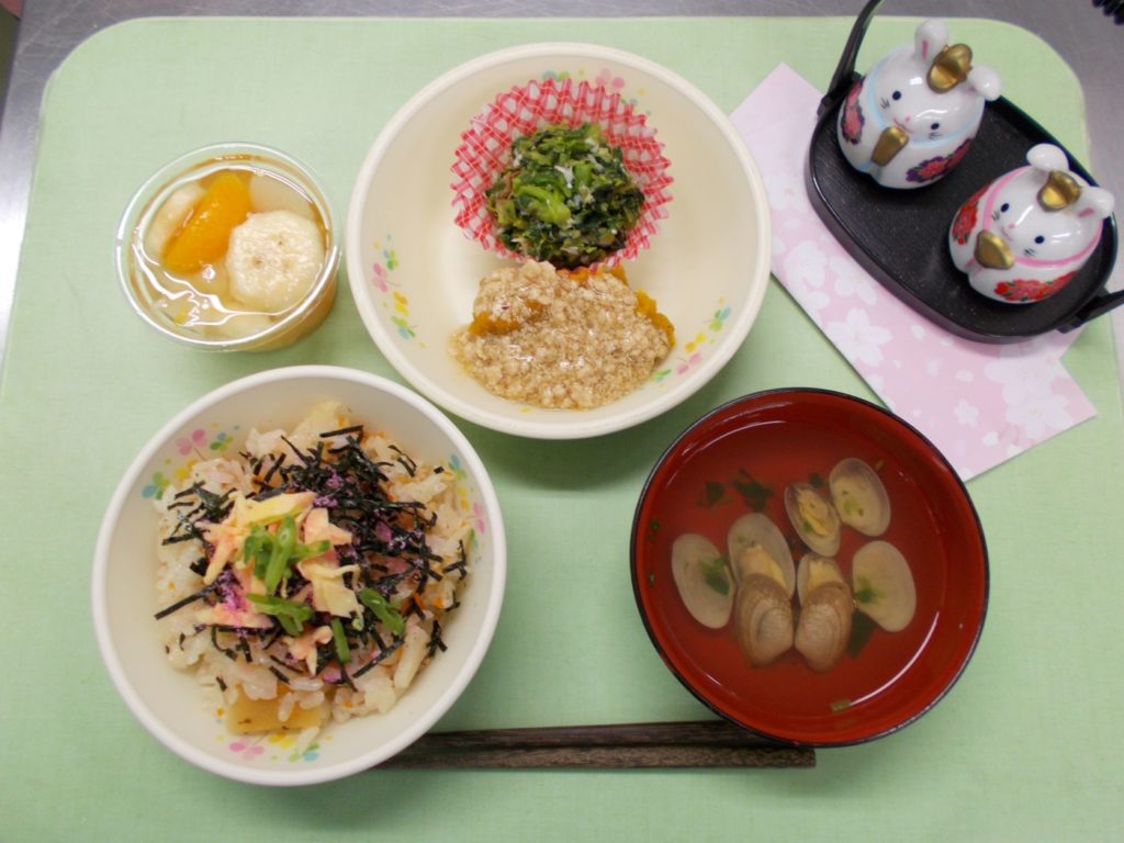 ホームきょうの給食 3/3 今日の給食 2023年3月3日 子どもたちが大好きな給食やおやつを毎日紹介しています! 【幼児食・乳児食】 昼食 五目ちらし寿司 (乳:混ぜごはん) 潮汁 かぼちゃのそぼろあん 菜花のおかか和え フルーツポンチ 3時のおやつ 牛乳 ひなババロア 10時のおやつ(乳児のみ) 野菜ジュース