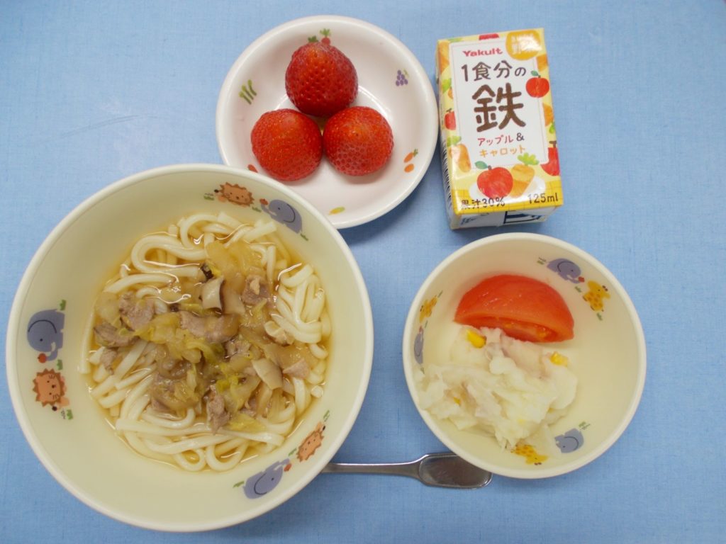 ホームきょうの給食 3/11 今日の給食 2023年3月11日 子どもたちが大好きな給食やおやつを毎日紹介しています! 【幼児食・乳児食】 昼食 甘辛うどん ジャーマンポテトサラダ トマト 野菜ジュース いちご 3時のおやつ 麦茶 ふりかけおにぎり 食べる小魚 10時のおやつ(乳児のみ) ジョア