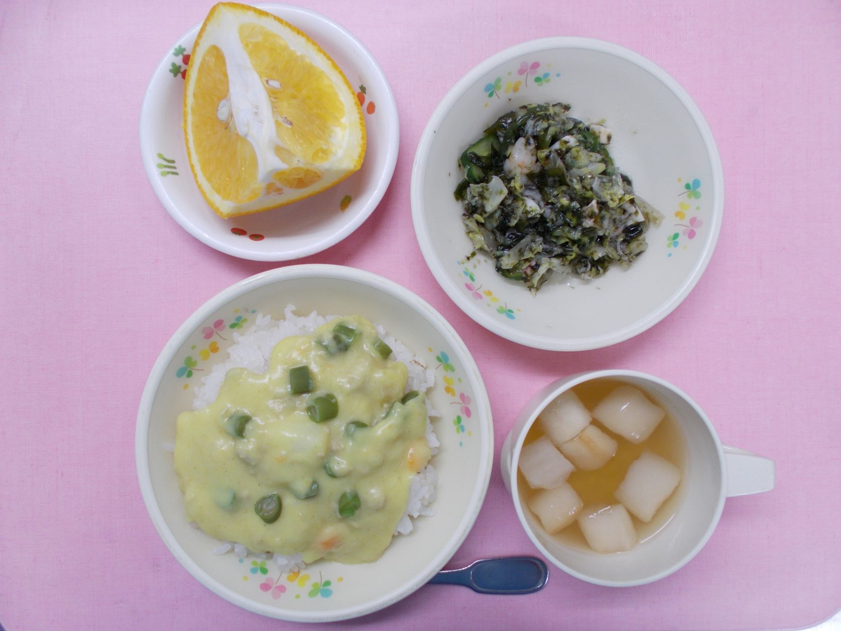 ホームきょうの給食 3/17 今日の給食 2023年3月17日 子どもたちが大好きな給食やおやつを毎日紹介しています! 【幼児食・乳児食】 昼食 カレー麦ライス (め・き:ポークライス&ウインナー) すまし汁 シーフードサラダ 甘夏 3時のおやつ 牛乳 焼き芋 10時のおやつ(乳児のみ) 野菜ジュース
