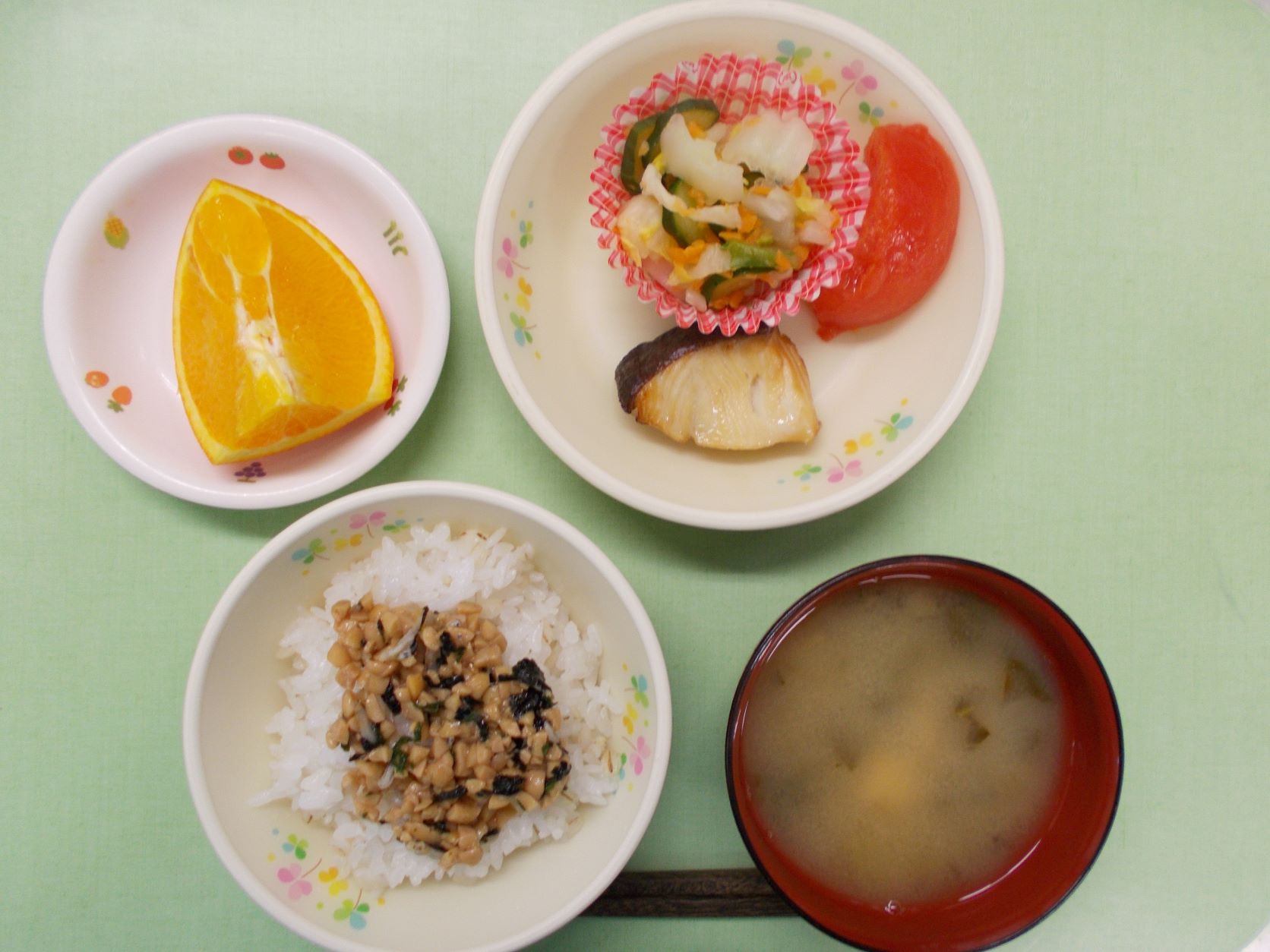 ホームきょうの給食 3/20 今日の給食 2023年3月20日 子どもたちが大好きな給食やおやつを毎日紹介しています! 【幼児食・乳児食】 昼食 納豆麦ごはん (乳:納豆ごはん) みそ汁 銀だらの照り焼き 塩もみ野菜 トマト オレンジ 3時のおやつ 牛乳 ウインナーカップケーキ 10時のおやつ(乳児のみ) ジョア