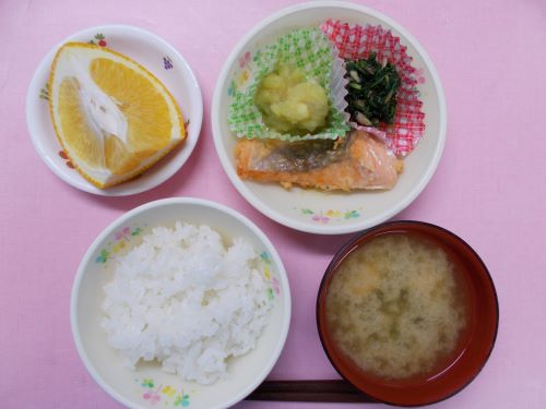 ホームきょうの給食 6/2 今日の給食 2023年6月2日 子どもたちが大好きな給食やおやつを毎日紹介しています! 【幼児食・乳児食】 昼食 ごはん みそ汁 サーモンステーキ さつまいもの甘煮 おひたし 甘夏 3時のおやつ 牛乳 豆腐マフィン 10時のおやつ(乳児のみ) 野菜ジュース