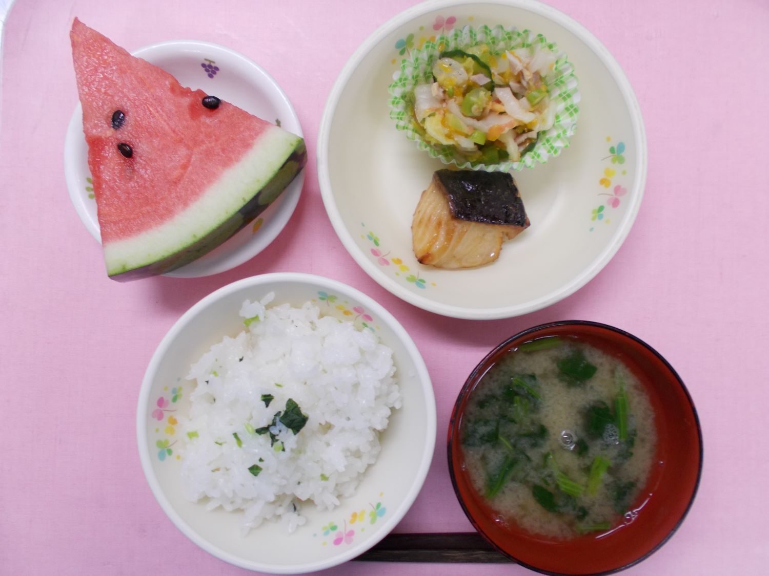 ホームきょうの給食 6/6今日の給食 2023年6月6日 子どもたちが大好きな給食やおやつを毎日紹介しています! 【幼児食・乳児食】 昼食 青菜ごはん みそ汁 銀だらの照り焼き 白菜フレンチサラダ すいか 3時のおやつ 牛乳 スパイスライス ぬか漬け 10時のおやつ(乳児のみ) ジョア