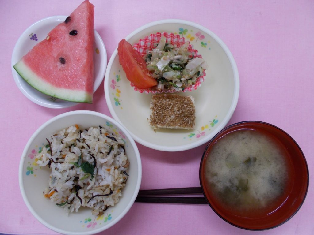 ホームきょうの給食 6/23 今日の給食 2023年6月23日 子どもたちが大好きな給食やおやつを毎日紹介しています! 【幼児食・乳児食】 昼食 ひじきごはん みそ汁 松風焼き 切干大根のサラダ トマト すいか 3時のおやつ 牛乳 小町麩スナック 10時のおやつ(乳児のみ) 牛乳