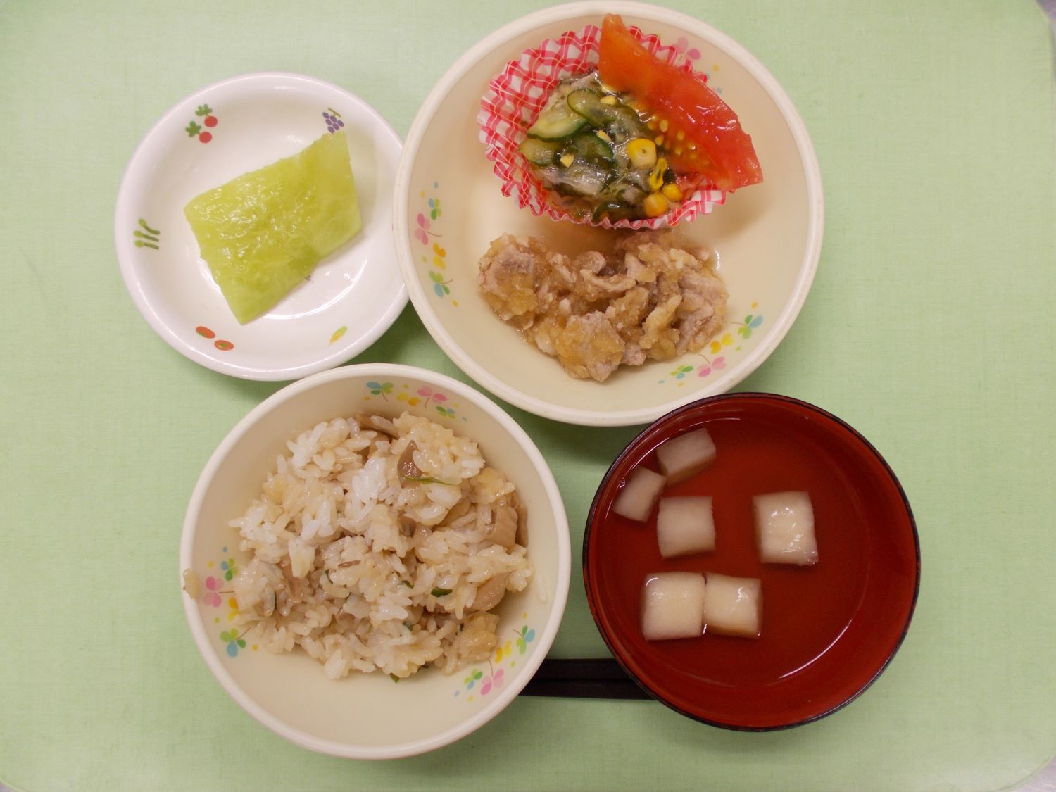 ホームきょうの給食 6/26 今日の給食 2023年6月26日 子どもたちが大好きな給食やおやつを毎日紹介しています! 【幼児食・乳児食】 昼食 まいたけごはん (ごはんからの献立変更) すまし汁 蒸し豚のおろし和え 酢の物 トマト メロン 3時のおやつ 牛乳 骨太おにぎり ぬか漬け 10時のおやつ(乳児のみ) 牛乳