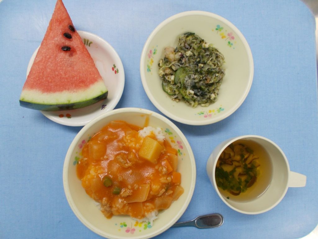ホームきょうの給食 7/28 今日の給食 2023年7月28日 子どもたちが大好きな給食やおやつを毎日紹介しています! 【幼児食・乳児食】 昼食 ハヤシ麦ライス (乳:ハヤシライス) すまし汁 シーフードサラダ すいか 3時のおやつ 牛乳 小町麩スナック 10時のおやつ(乳児のみ) ジョア