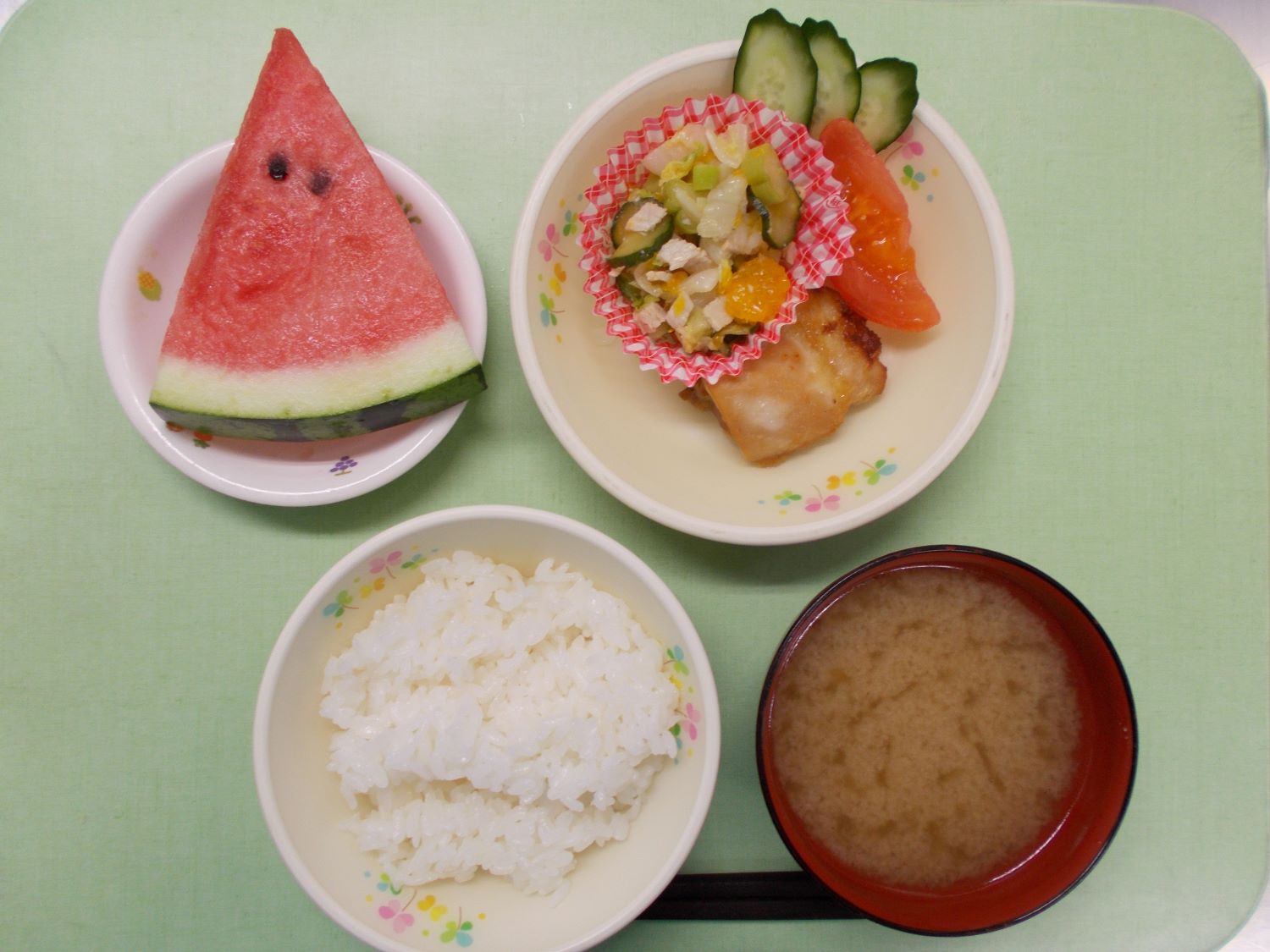 ホームきょうの給食 8/1 今日の給食 2023年8月1日 子どもたちが大好きな給食やおやつを毎日紹介しています! 【幼児食・乳児食】 昼食 ごはん みそ汁 からあげ 白菜フレンチサラダ トマト ぬか漬け すいか 3時のおやつ 牛乳 そぼろごはん 食べる小魚 10時のおやつ(乳児のみ) ジョア