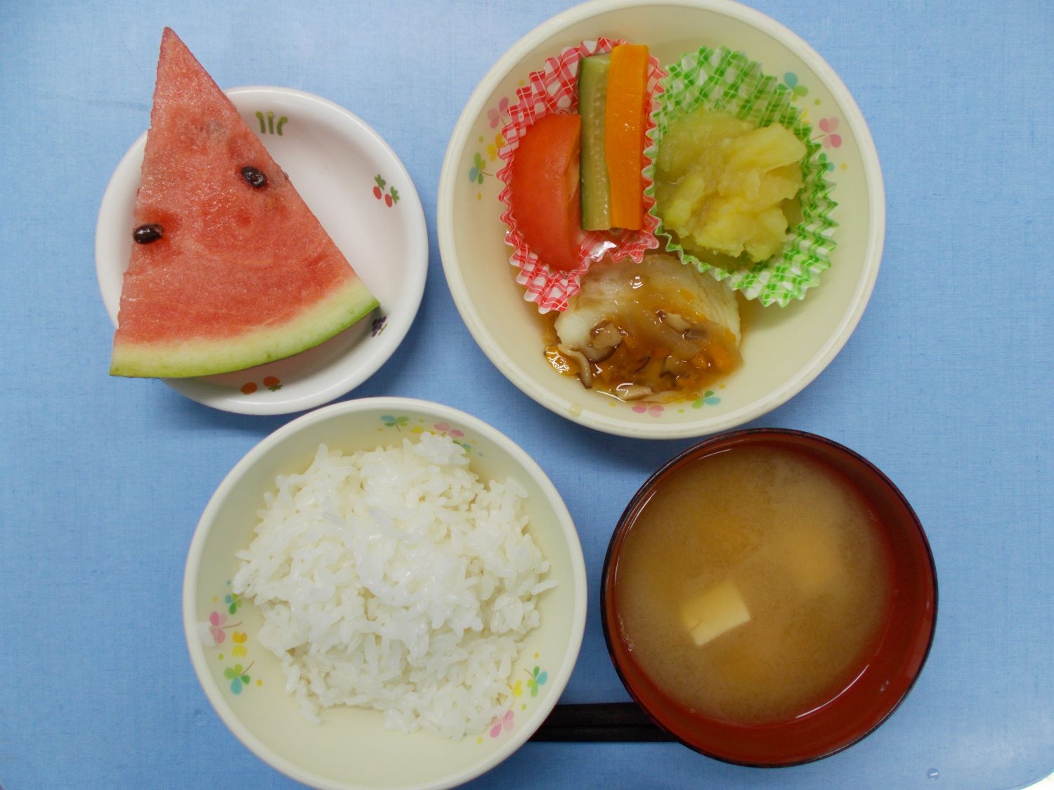 ホームきょうの給食 8/8 今日の給食 2023年8月8日 子どもたちが大好きな給食やおやつを毎日紹介しています! 【幼児食・乳児食】 昼食 ごはん みそ汁 かれいの甘酢あんかけ さつまいもの甘煮 スティック野菜 すいか 3時のおやつ 牛乳 ジャムサンド 10時のおやつ(乳児のみ) ジョア