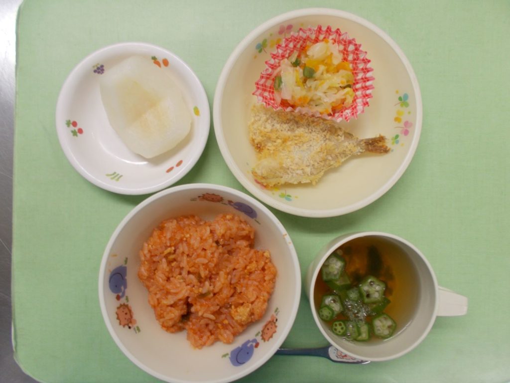 ホームきょうの給食 9/5今日の給食 2023年9月5日 子どもたちが大好きな給食やおやつを毎日紹介しています! 【幼児食・乳児食】 昼食 チキンライス おくらスープ キスフライ (乳:カレイのフライ) キャベツサラダ 梨 (※柿→梨に変更しました。) 3時のおやつ 牛乳 骨太おにぎり ぬか漬け 10時のおやつ(乳児のみ) 牛乳