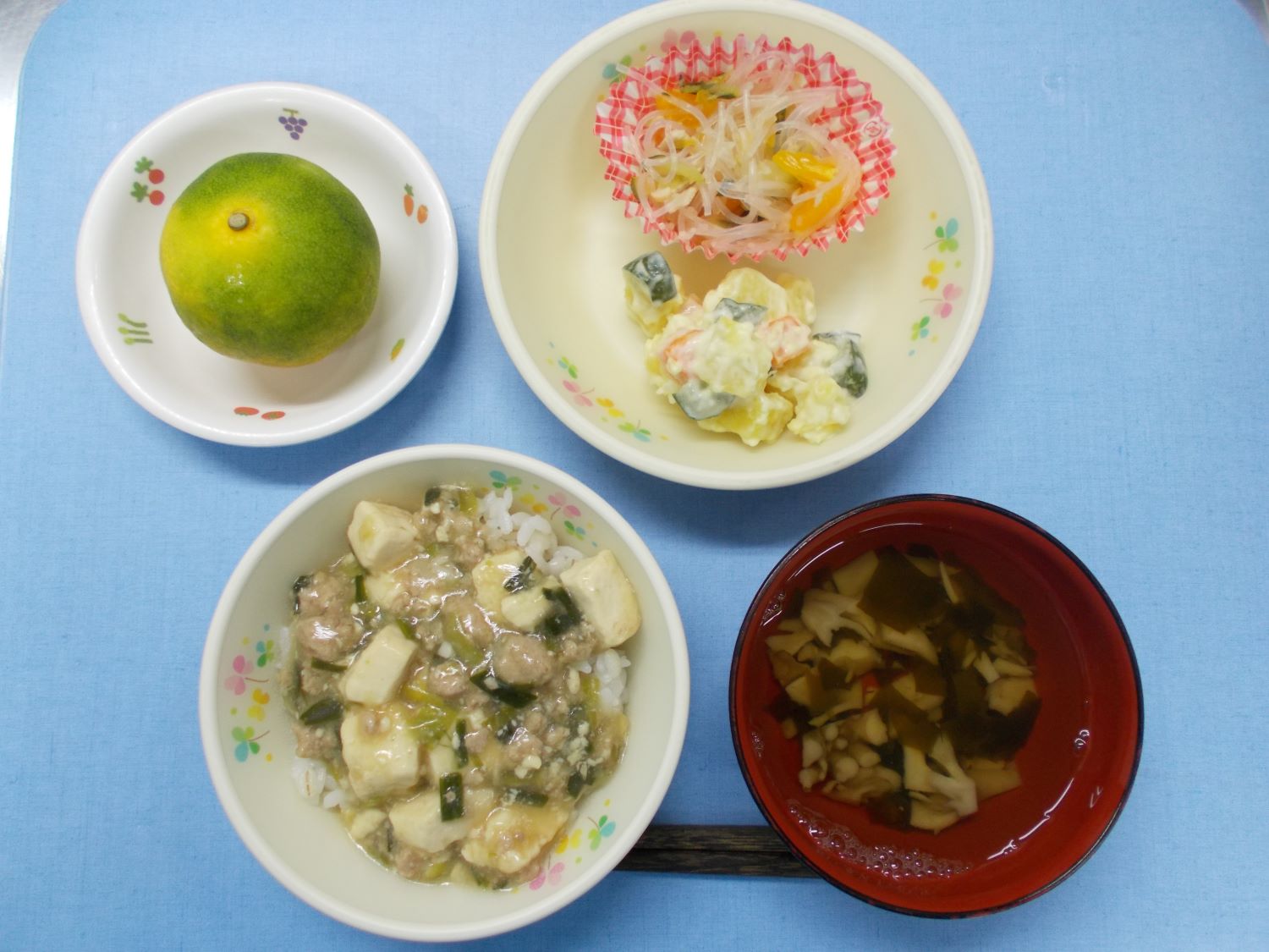 ホームきょうの給食 9/13今日の給食 2023年9月13日 子どもたちが大好きな給食やおやつを毎日紹介しています! 【幼児食・乳児食】 昼食 マーボー麦丼 すまし汁 さつまいものマセドアン バンサンスー みかん 3時のおやつ 牛乳 お好み焼き 10時のおやつ(乳児のみ) 牛乳